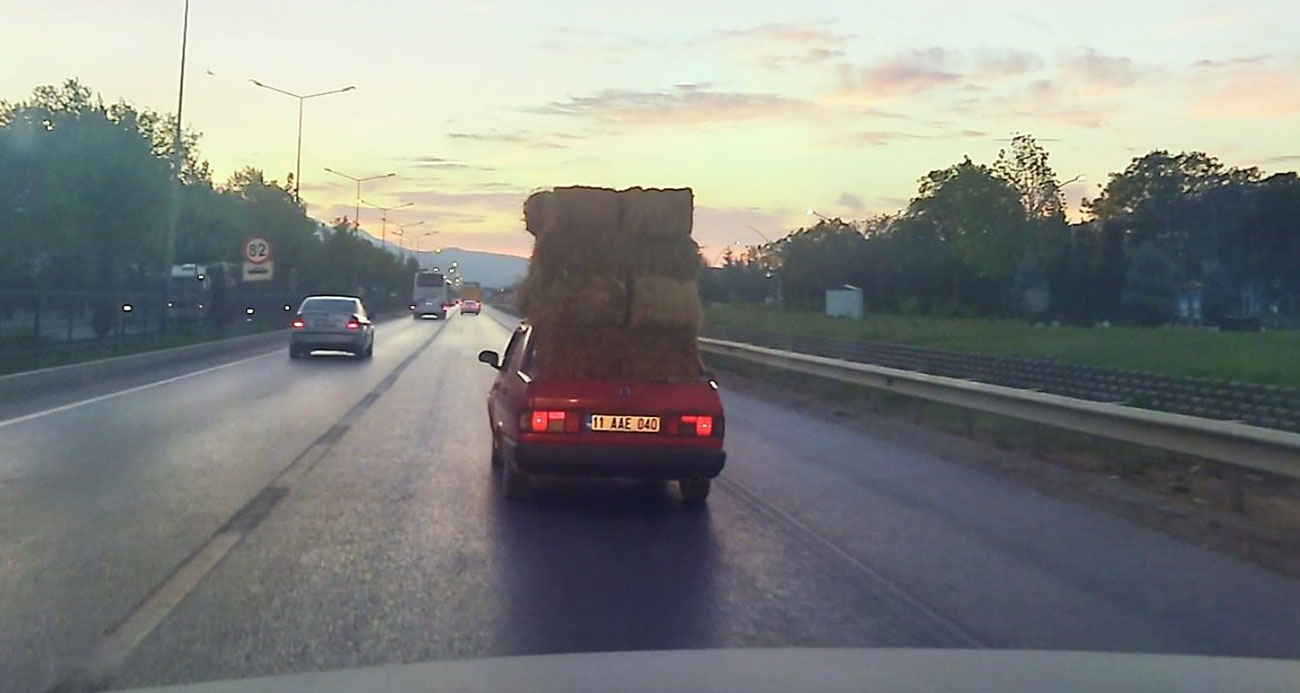 Otomobil üzerinde saman balyaları taşıdı