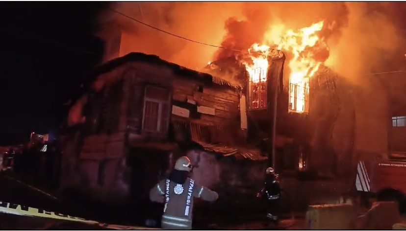 Fatihte 2 katlı ahşap metruk bina alev alev yandı
